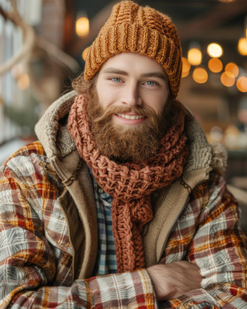 Winter portrait of a bearded man in a knitted hat, scarf and sweater.