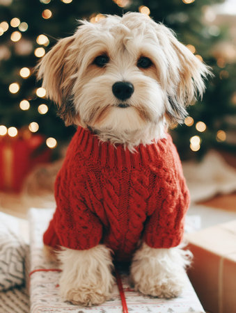 A small dog wearing a red knitted Christmas sweater sitting on a gift-wrapped box, twinkling festive lights in the background, cozy indoor setting, bokeh glow, holiday mood, ultra-clean pet photography style. --chaos 55 --ar 3:4 --v 7 Job ID: 9850f5bc-4fc8-4b3d-9333-db798219eb4b