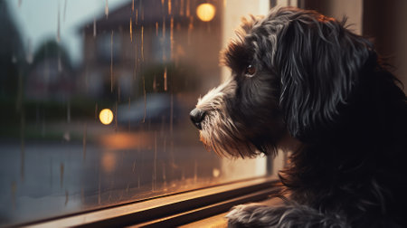 A sad dog looks out the window and waits for its owner. High quality photo