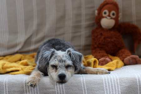 Cute small mixed breed dog with a toy on sofa in living room.