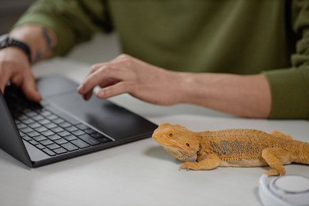 High angle view at yellow pet iguana sitting on desk with unrecognizable man using laptop copy space