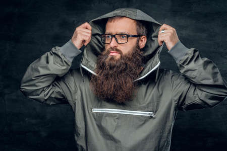 Pensive Black bearded male dressed in a fleece shirt, sunglasses and baseball cap posing over grey background.