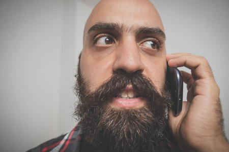 hipster long bearded and mustache man with shirt squares calling with cellphone