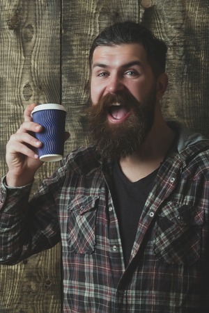 hipster with grey hair, long beard and moustache smiling with blue plastic cup on wooden background. Coffee to go. Healthy lifestyle and dieting