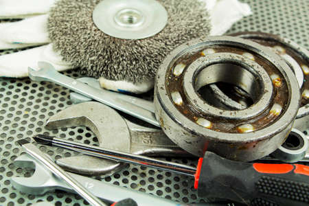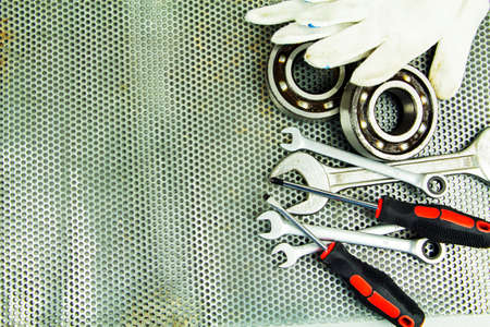 Metalworking tools, steel parts, a wrench, on the background of a metal lattice