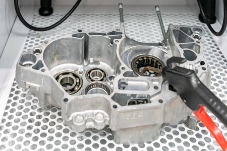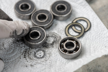 Unrecognizable person cleaning a bicycle bearing in his bike workshop as part of a maintenance service. Real people at work.