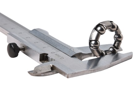 vernier caliper measures bearings against a metal background. Part of the mechanism.