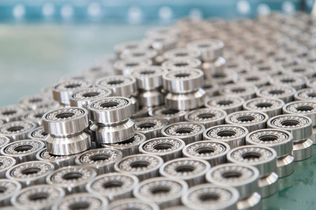 Finished products bearings in production after the conveyor. The glossy surface of steel products. Industrial industry concept.