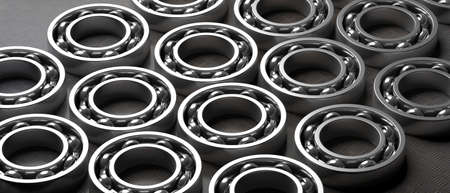 Ball bearings. Steel spare parts on industrial black metal sheet background. Machinery, engine mechanism, engineering concept. 3d illustration