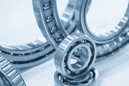 Close up scene the ball bearing parts in the light blue scene. The heavy mechanical part manufacturing concept.