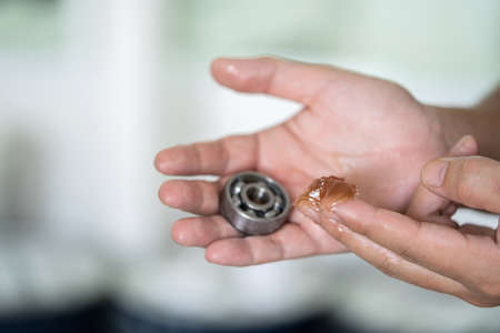 Worker use finger to put lithium grease into small bearing at laboratory. Yellow transparance grease on the finger. Testing and service concept. Preventive maintenance and checking bearing damage