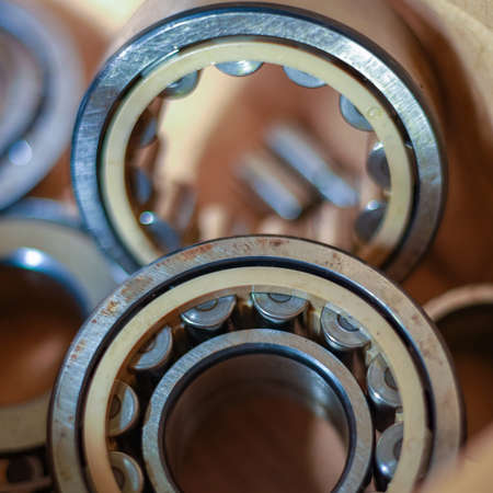 Close up scene the cylindrical rolling bearing parts. The heavy mechanical part manufacturing concept.
