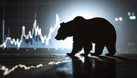 Dark bear silhouette casting a shadow over a cracked digital stock market chart, concept of bear market dominance, low light and moody colors,