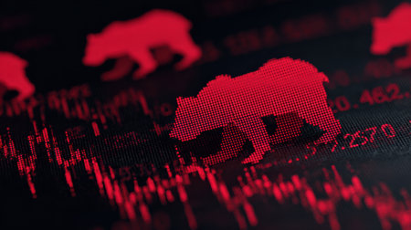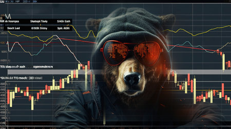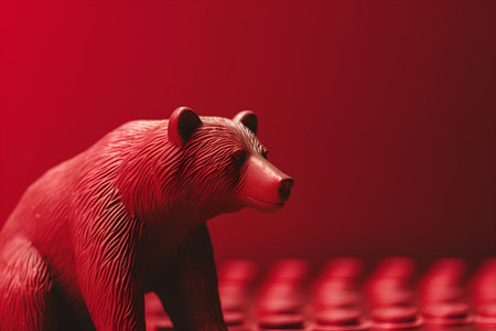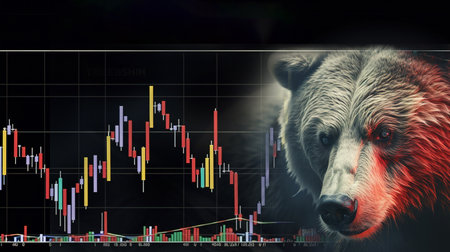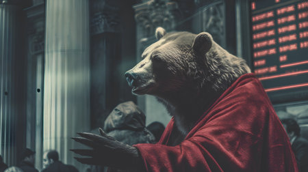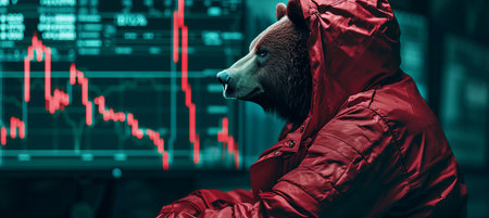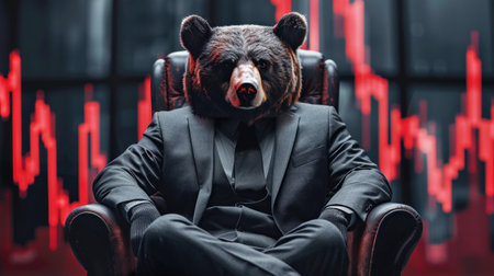 Bear in red suit with downtrend charts, trading volatility concept on blurred background
