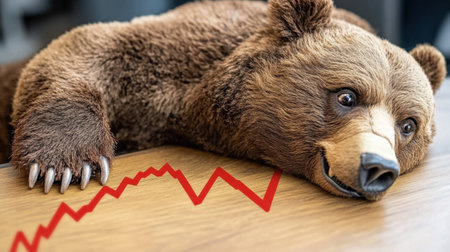 A relaxed bear rests its head on a table, with a red graph depicting a market decline in the background, showcasing themes of economic uncertainty and sentiment.
