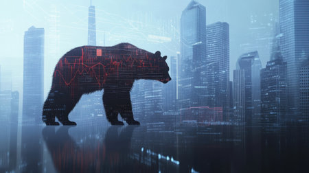 Double exposure of bear with declining stock market chart and cityscape background