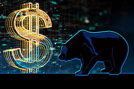 Abstract bear market hologram with golden dollar icon. Decreasing market and finance concept. 3D Rendering