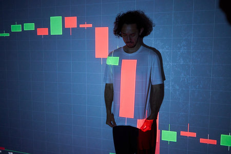 A trader-investor is watching the price movement on the screen with emotions. Analyzes the financial holographic chart of quotes. Comic image of a trader-investor.