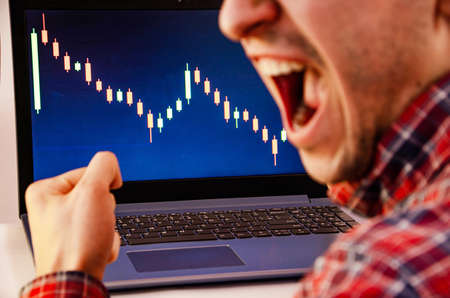 Trading on the exchange. Men's hands in a plaid shirt behind a laptop clenched into a fist. On-screen rates, promotions. Win, lose. Good luck and failure betting, trading. Focus on laptop and graphics