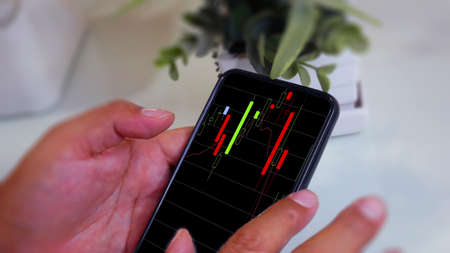 Female hand with smartphone trading stock online. Business concept