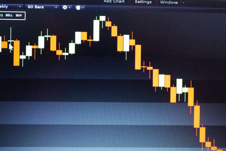 Shallow depth of field (selective focus) with details of a candlestick chart on a computer screen.