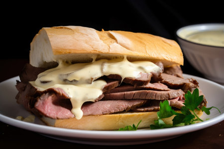 Close-up of a classic roast beef sandwich with creamy mayo and tangy Dijon mustard on soft white bread, AI Generated