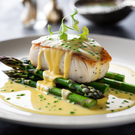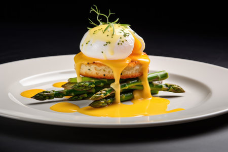 plated poached egg with hollandaise sauce and asparagus, created with generative ai