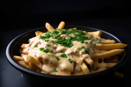 fries, drizzled with warm and creamy cheese sauce, created with generative ai