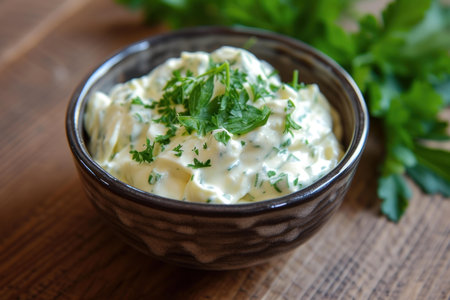 Close-up of creamy tartar sauce garnished with parsley in a rustic bowl on a wooden table