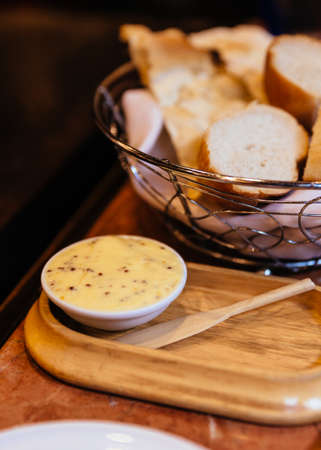 Italian butter in white cup served with fresh baked bread in basket.