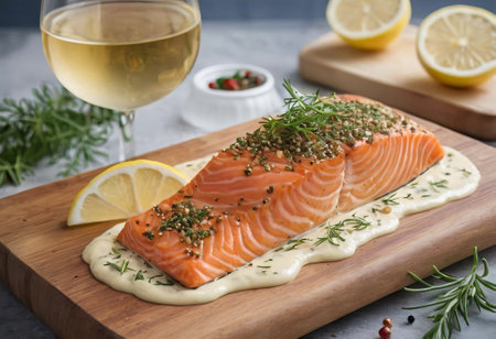 sous-vide salmon fillet, seared and served with lemon sauce, created with generative ai