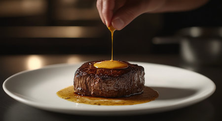 A chef's hand delicately drizzles sauce onto the top of an exquisite, perfectly seared filet mignon on a white plate in a dark kitchen setting. The dish is centered and captured from above with a shallow depth of field to focus solely on it while creating a soft background bokeh. The lighting casts gentle shadows around its edges, highlighting every detail from the textured exterior through the juicy center. This shot emphasizes the artistry behind each creation by gourmet chefs. --ar 78:43 --v 6.1 Job ID: 3685a2c2-d32a-486d-814f-6f7740a4eb19