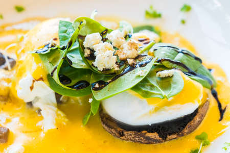 Mushroom and egg benedict in white plate