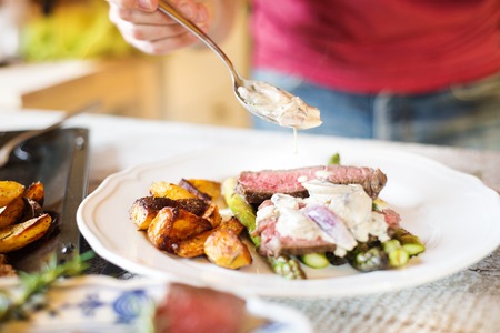 Man serving grilled beef steak, asparagus and baked potatoes