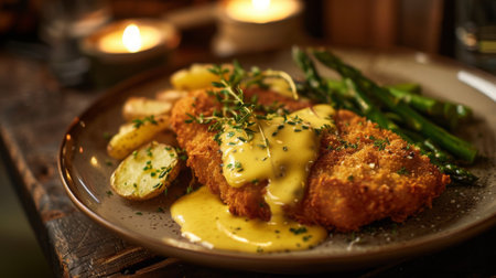 Crispy schnitzel covered in creamy hollandaise sauce, served with green asparagus and quartered potatoes on a dark plate.