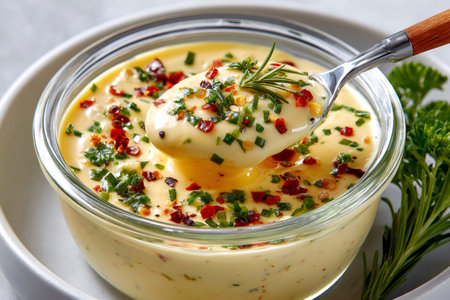 Creamy hollandaise sauce with herbs and chili flakes in a glass bowl on a plate