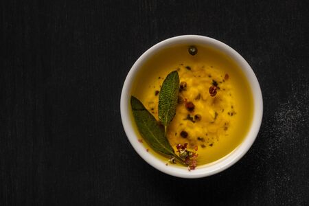 top view of aromatic oil in bowl with spices and herbs on black table