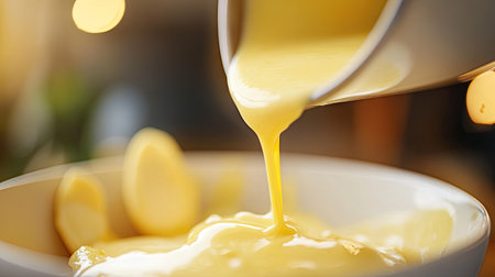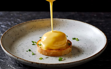 fresh hollandaise sauce being drizzled on eggs, created with generative ai