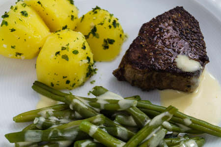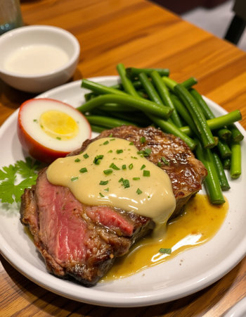 Beef steak with green beans and egg