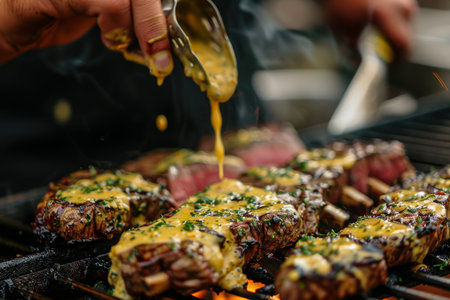 Chef grilling steak in creamy lemon butter or cajun sauce with aromatic herbs for a flavorful dish