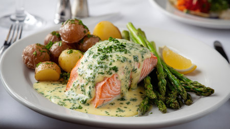 High-angle, shot features a beautifully presented serving of cooked salmon, liberally covered in a pale green, creamy, herb-infused sauce, resting on a white round plate. Accompanying the fish are several small, roasted or boiled potatoes with their skins on, and a neat bundle of bright green, steamed asparagus spears, garnished with a wedge of fresh yellow lemon. The setting suggests an upscale dining environment with white linen and out-of-focus elements like cutlery and another dish in the background.