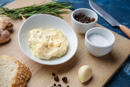 Bowl with garlic butter and ingredients on color background, closeup
