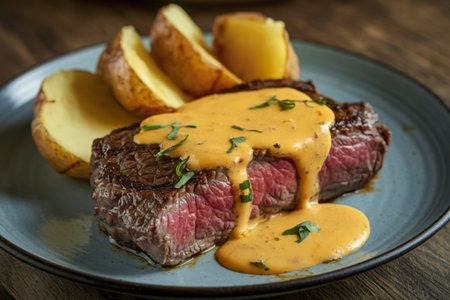 a beef steak, sliced potatoes, and cheese sauce