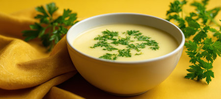 Creamy Corn Soup with Parsley Garnish on Yellow Background