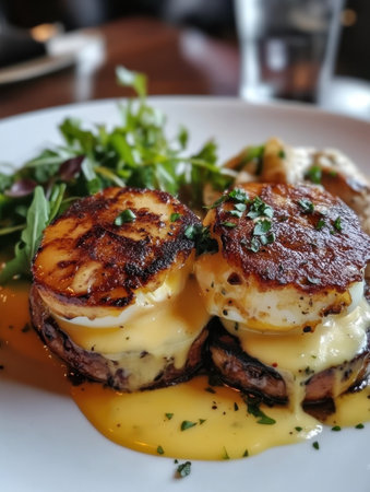 A close-up view of perfectly plated eggs benedict topped with creamy hollandaise sauce, accompanied by vibrant greens. Ideal for a relaxing brunch setting, showing freshness and flavor.