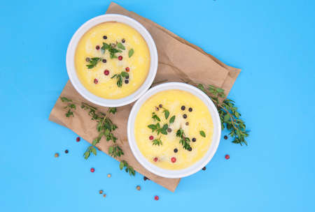 Delicious creamy corn soup. Close up