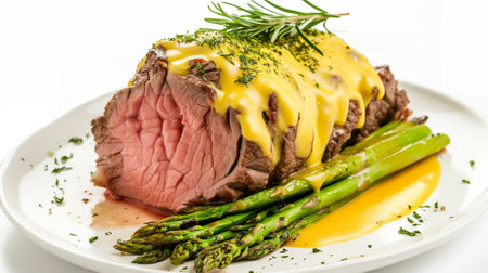 Roasted beef with cheese and asparagus on white background