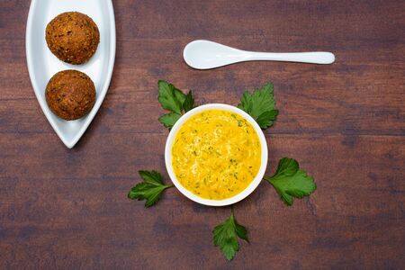Chickpea falafel is lying in an almond-shaped bowl, beside is a ceramic spoon and a bowl with tahini sauce with turmeric and minced parsley leaves.
