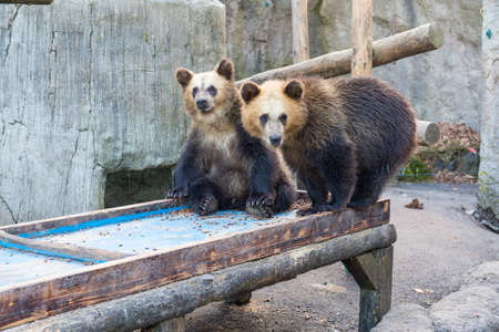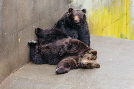 Two raised Brown Bear sleep on the concrete ground in animal area at Noboribetsu Bear Park in Hokkaido, Japan.