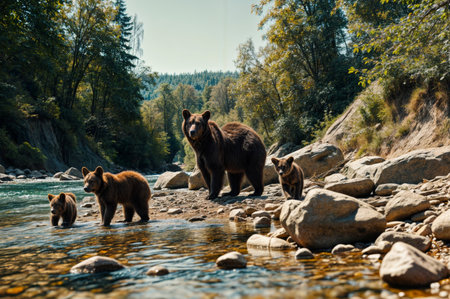 Illustrate a family of bears enjoying a moment of peace in their natural habitat, emphasizing wildlife in a natural environment --chaos 30 --ar 16:9 --v 6.1 Job ID: 07c77b09-e717-485b-bed0-39597d91e444
